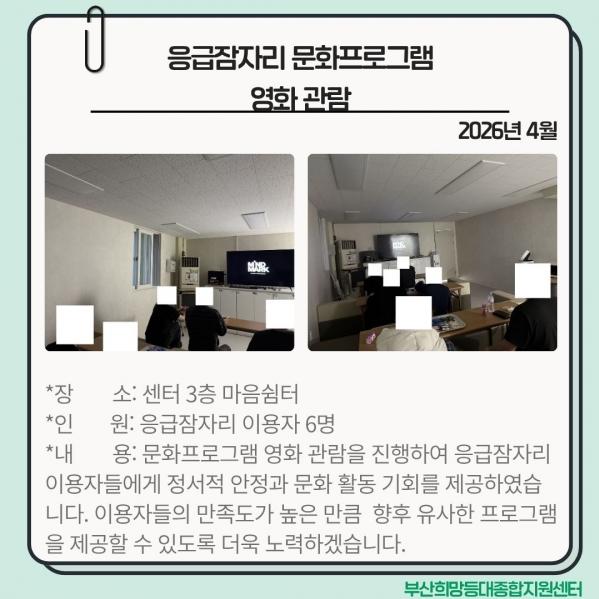 2026³â 4¿ù ÀÀ±ÞÀáÀÚ¸® ¹®ÈÇÁ·Î±×·¥(¿µÈ°ü¶÷) ÁøÇà