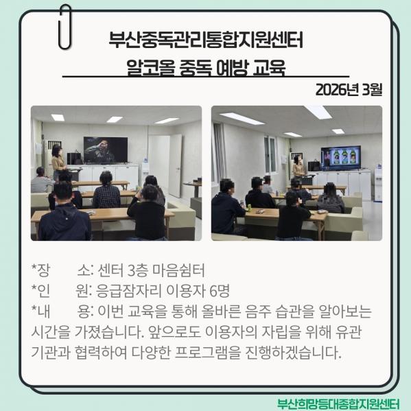 2026³â 3¿ù À¯°ü ±â°ü(ºÎ»êÁßµ¶°ü¸®ÅëÇÕÁö¿ø¼¾ÅÍ) Çù·Â (¾ËÄÚ¿Ã Áßµ¶ ¿¹¹æ)±³À°ÇÁ·Î±×·¥ ÁøÇà