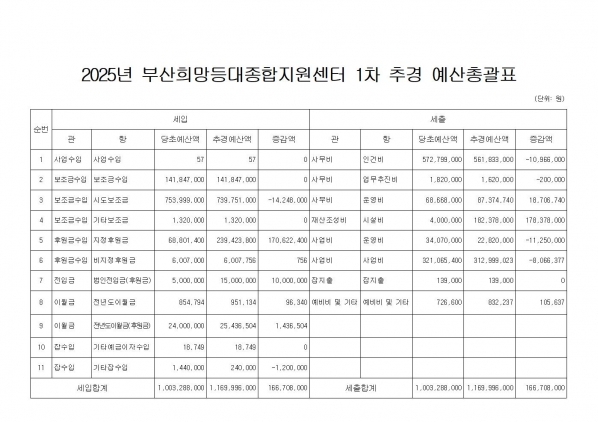 ºÎ»êÈñ¸Áµî´ëÁ¾ÇÕÁö¿ø¼¾ÅÍ 2025³âµµ 1Â÷ Ãß°¡°æÁ¤¿¹»ê¼¸¦ ¾Æ·¡¿Í °°ÀÌ °ø°íÇÕ´Ï´Ù.